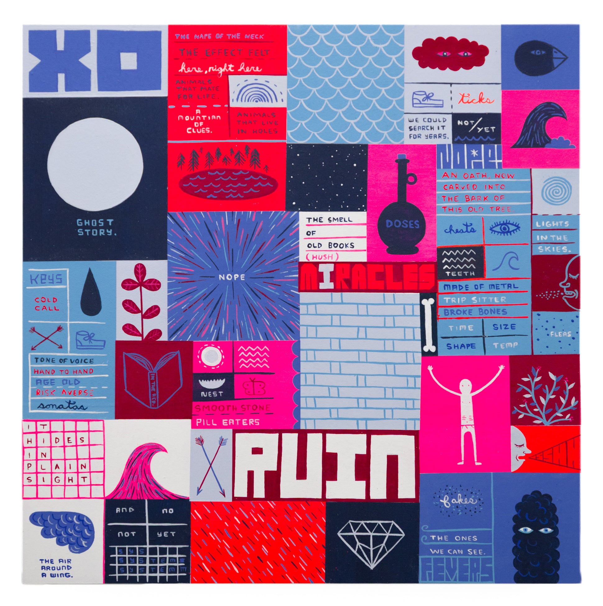 “I’ve known Jim Houser since the mid-90’s when he worked with me in Providence primarily cutting stickers by hand. At the time, his unique drawings began to evolve into complex compositions of characters and typography within a mosaic of color blocks. This approach to his