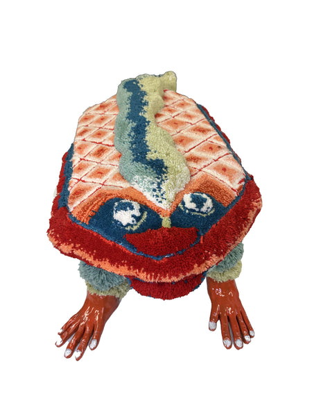 38” long x 18” wide x 18” tallhand made rug with %100 wool yarn hand sewn and upholstered on found wood bench4 ceramic feet 9" x 5" x 2"